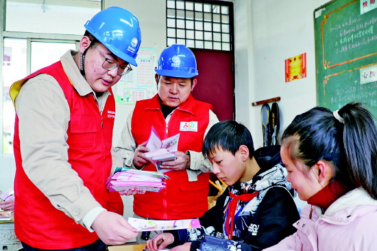 近日,国网建湖县供电公司组织共产党员服务队,走进江苏省盐城市建湖县庆丰中学,开展安全用电宣传活动。图为服务队队员向同学们发放宣传手册,讲解安全用电知识。 薛锦程 摄