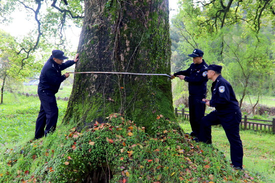 ▲ 为进一步加强古树名木保护,江西省分宜县公安局森林警察大队组织民辅警对辖区古树名木开展巡护工作,实地查看古树名木周边生态环境、保护标志等设施,排查安全隐患,为古树名木撑起“保护伞”。图为4月1日,民警在钤山镇防里村古樟林巡护古树。 本报记者 黄辉 本报通讯员 黄小军 摄
