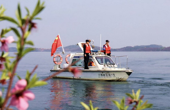 ▲ 近日,安徽省舒城县公安局万佛湖旅游度假区派出所组织警力在万佛湖水域开展巡逻防控,全力守护辖区生态环境。图为民警在湖面巡逻。 本报通讯员 王可海 摄