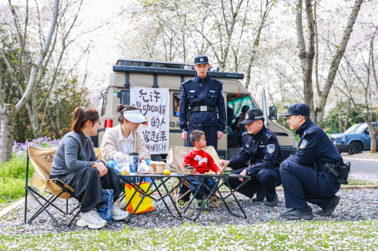 图① 近日,浙江省安吉县公安局递铺派出所民警深入辖区樱花公园,开展巡逻防控与普法宣传。图为民警在露营区与游客交流,讲解防走失、防诈骗及交通安全知识。