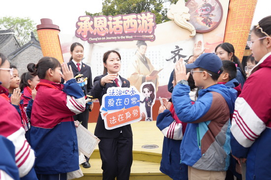 图② 近日,江苏省淮安市淮安区人民检察院借中小学生春假契机走进吴承恩故居,为研学的学生带来一场别开生面的“法话西游”沉浸式普法活动。图为检察干警通过问答形式引导学生在轻松愉快的氛围里学习法律知识。