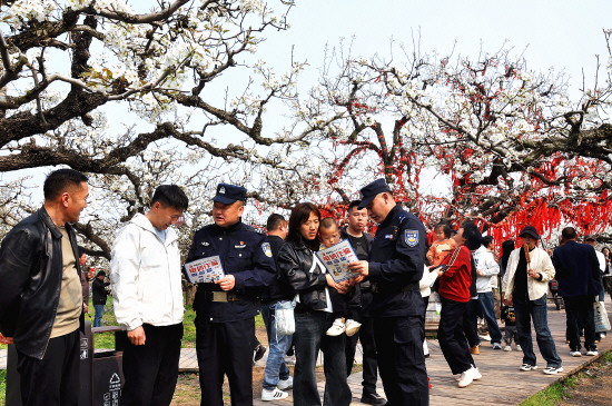 图③ 近日,安徽省砀山县40万亩梨花迎来盛开期,砀山县公安局组织民辅警对人员密集区域、重点路段进行治安巡逻,开展安全防范宣传,提高游客的防范意识。图为民辅警在景区开展反诈宣传。