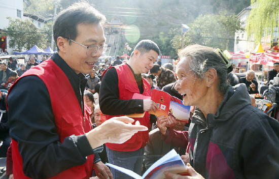 近日,河南省汝阳县司法局流动普法宣传站的普法志愿者走进城关镇云梦庙会,向逛庙会的群众普及法律知识。图为志愿者为老年人讲解民法典相关内容。