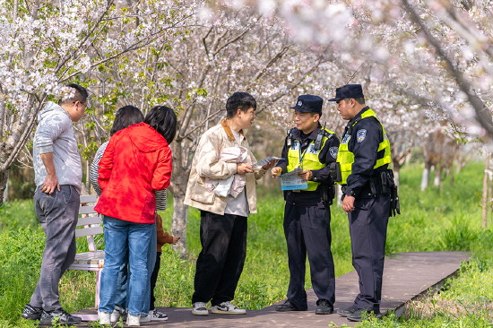 上海市公安局崇明分局汲浜派出所近日组织民警在樱花园开展常态化巡逻,并向踏青赏花游客普及法律知识。图为民警向游客讲解反诈知识。 本报通讯员 沈群 摄