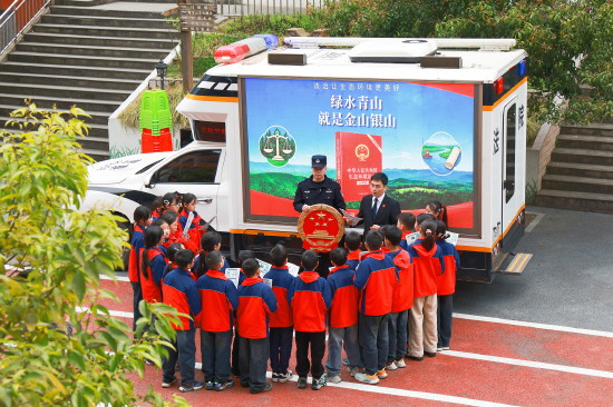 图① 近日,重庆市万州区人民法院干警走进开州区雪宝山镇平安希望中心小学,开展以“法治让生态环境更美好”为主题的生态环境法典普法宣传活动。图为干警向孩子们讲解生态环境法典相关知识。