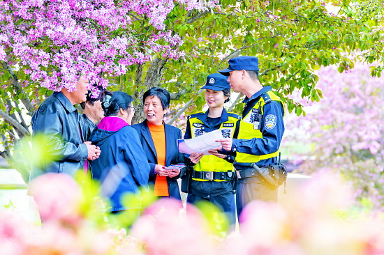 ▲ 近日,位于上海市崇明区三星镇新安村的海棠花进入盛花期,吸引了大量市民游客来此赏花。上海市公安局崇明分局三星派出所组织警力在现场同步做好警情处置、秩序维护、防范宣传和服务群众等工作,保障群众出行平安。图为4月11日,民警向游客普及反诈知识。 本报通讯员 沈群 摄