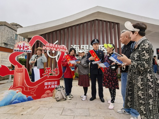 ▲ 4月11日,福建平潭综合实验区国家安全局联合公安局等部门在景区、国家安全教育基地等点位设置国家安全主题打卡点,推动国家安全教育深入人心。图为民警和工作人员向游客开展反间防谍宣传教育。 本报记者 王莹 本报通讯员 周娇娇 摄