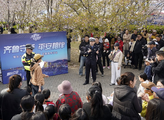 ▲ 4月11日,山东省烟台市公安局在牟平区龙湖樱花大道举办“齐鲁守护·平安相伴”国家安全教育主题活动,让游客在轻松的氛围中提升国家安全意识。图为民辅警与游客互动问答。 本报通讯员 臧保东 宋佳 摄