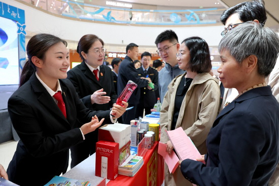 ▲ 山东省枣庄市近日组织公安、法院、市场监管等部门联合开展形式多样的知识产权周宣传活动,引导市民增强保护知识产权意识。图为4月20日,法官在商场向群众讲解商标权的相关知识。
