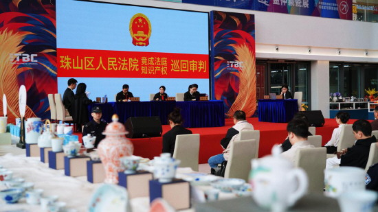▲ 江西省景德镇市珠山区人民法院近日将法庭“搬”进景德镇陶博城大厅,公开审理一起涉陶瓷著作权侵权纠纷案。庭审结束后,法院通过以案释法、互动答疑等方式,宣讲知识产权法律法规。图为巡回审判现场。