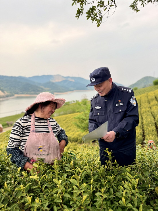 ▲ 近日,浙江省宁波市公安局鄞州区分局横溪派出所组织民警深入辖区茶园,开展生态警务普法宣传活动。图为民警为茶农发放普法资料。