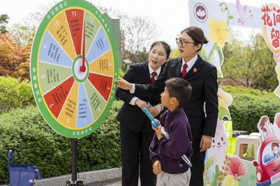 连日来,江苏省南京市高淳区人民法院联合国际慢城景区管委会开展“慢城春光美 法治伴君行”主题普法活动。图为法院干警通过“学法辨是非”转盘问答互动游戏为游客普及法律知识。
