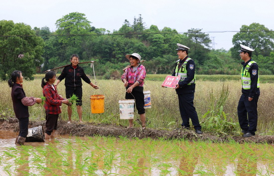 眼下正值农忙时节,近日,江西省遂川县公安局交管大队组织民辅警深入田间地头,通过唠家常、以案释法、现场答疑等方式,向村民宣传道路交通安全法律法规,引导群众安全文明出行。图为辅警走进雩田镇江背村,向正在劳作的村民普及交通安全知识。 本报记者 黄辉 本报通讯员 肖遂冬 摄